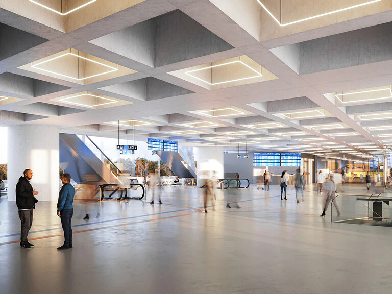 The overpass spans the railway station terminal, the multi-storey car park and the bus station. The terminal connects various forms of local transport – rail, bus, cycle paths – with the high-speed railway line. This is connected to the existing road situation via a new link road. All modes of transport are directly connected to the entrance hall of the terminal.