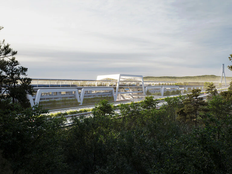 The overpass spans the railway station terminal, the multi-storey car park and the bus station. The terminal connects various forms of local transport – rail, bus, cycle paths – with the high-speed railway line. This is connected to the existing road situation via a new link road. All modes of transport are directly connected to the entrance hall of the terminal.